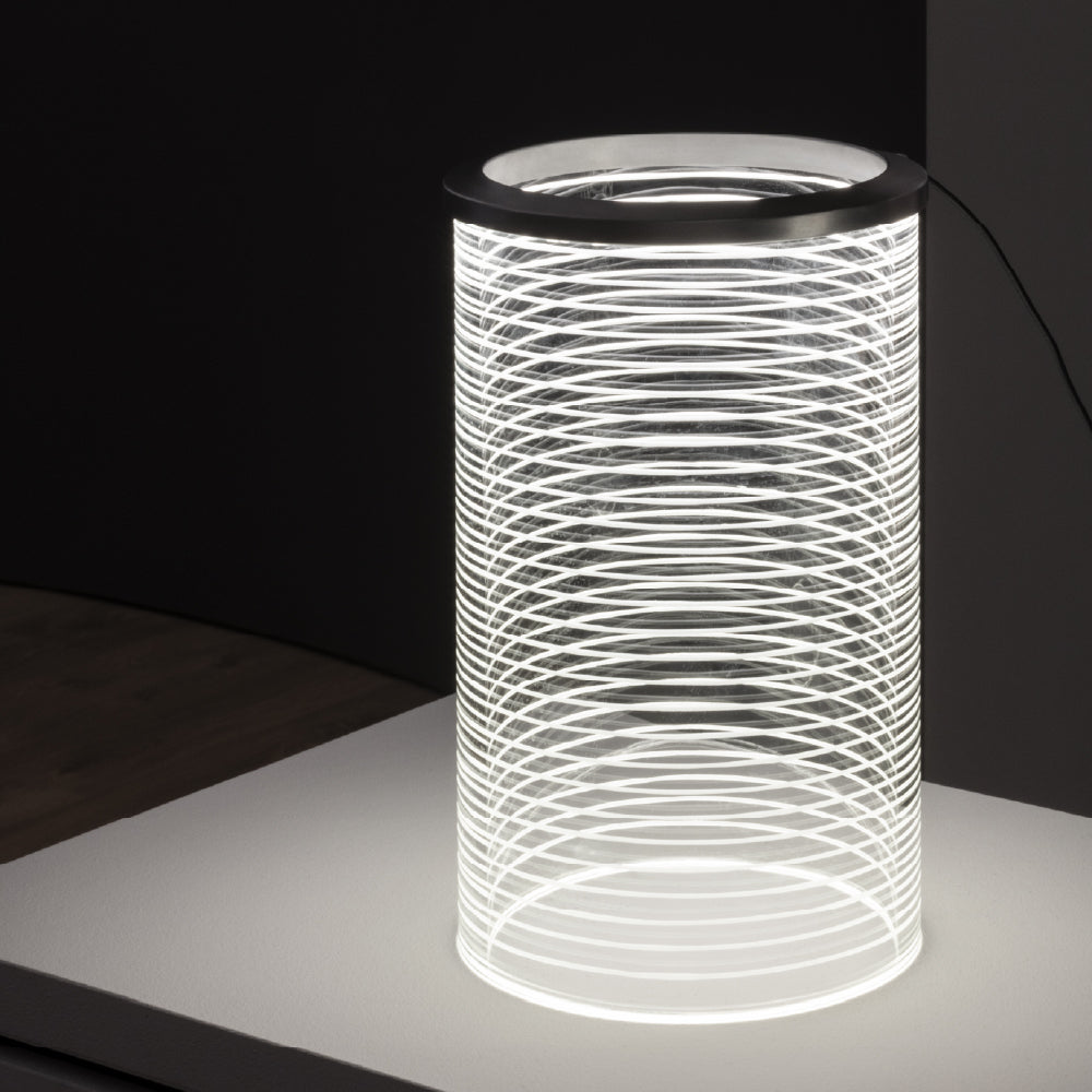 Le diffuseur est en verre transparent soufflé à la main dans un moule à la forme ondulée dont les sommets sont ensuite meulés pour créer une texture horizontale qui alterne des bandes diffusantes transparentes et opalines. Ce travail enrichit élégamment le diffuseur mais crée surtout une diffusion de la lumière sans éblouissement le long du corps cylindrique.